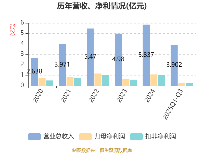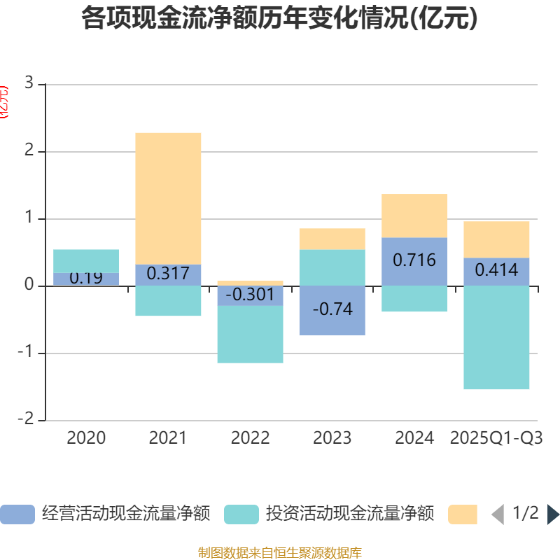 2025年前三季度,公司经营活动现金流净额为4135.91万元,同比增长464.5%;筹资活动现金流净额5420.39万元,同比增加1.02亿元;投资活动现金流净额-1.54亿元,上年同期为-7903.01万元。