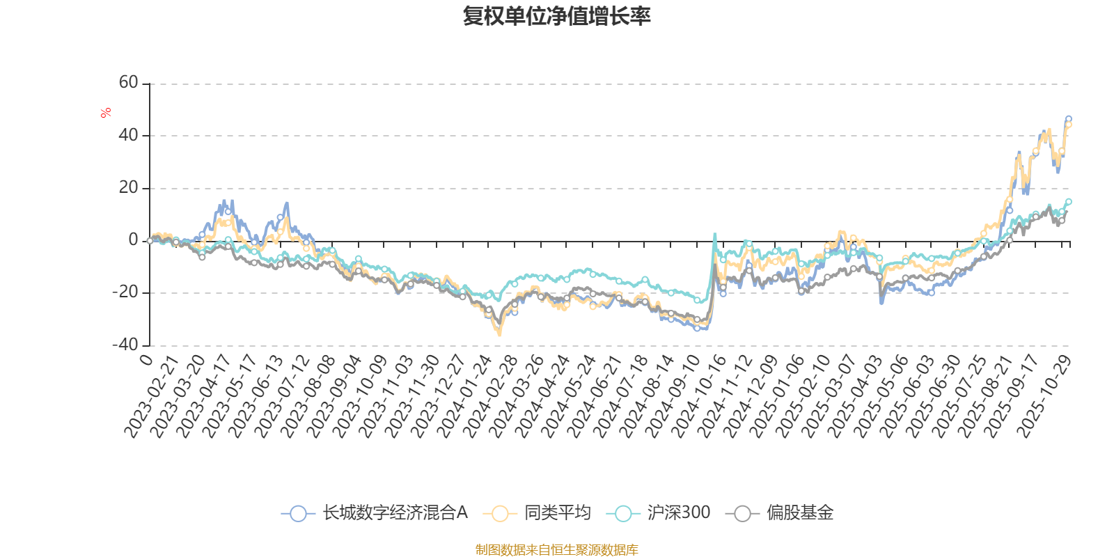 截至10月29日,长城数字经济混合A近三个月复权单位净值增长率为49.45%,位于同类可比基金44/229;近半年复权单位净值增长率为78.59%,位于同类可比基金61/229;近一年复权单位净值增长率为74.59%,位于同类可比基金54/213。