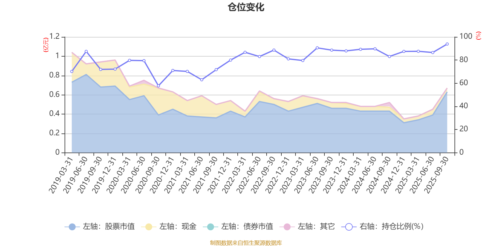 据定期报告数据统计,近三年平均股票仓位为87.09%,同类平均为72.35%。2025年三季度末基金达到93.85%的最高仓位,2020年三季度末最低,为57.75%。