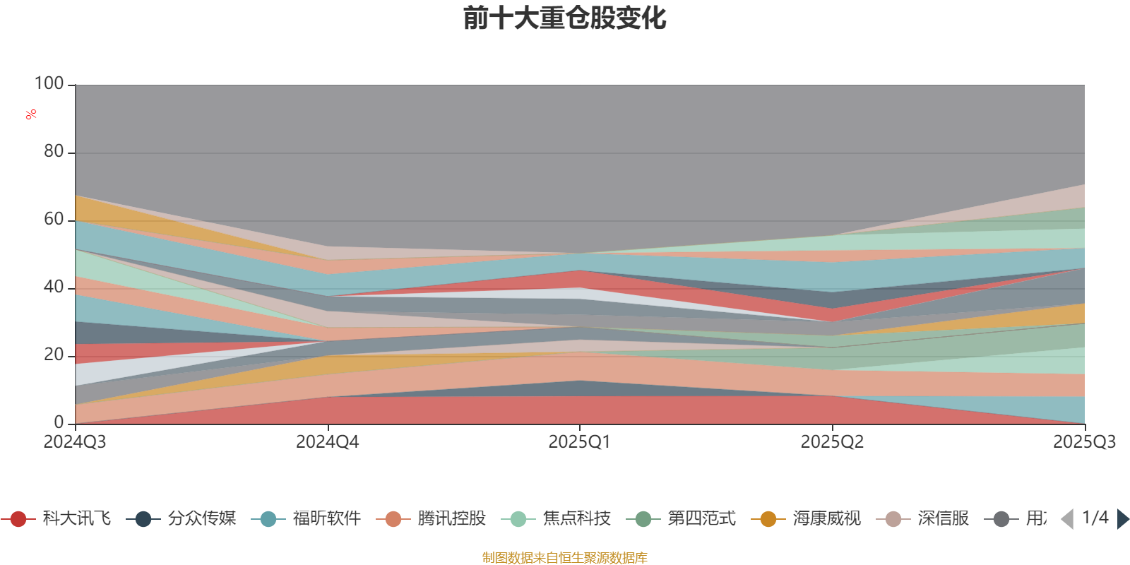 该基金持股集中度较高。截至2025年三季度末,基金十大重仓股分别是阿里巴巴-W、福昕软件、焦点科技、第四范式、浪潮信息、腾讯控股、九方智投控股、金蝶国际、华大九天、快手-W。