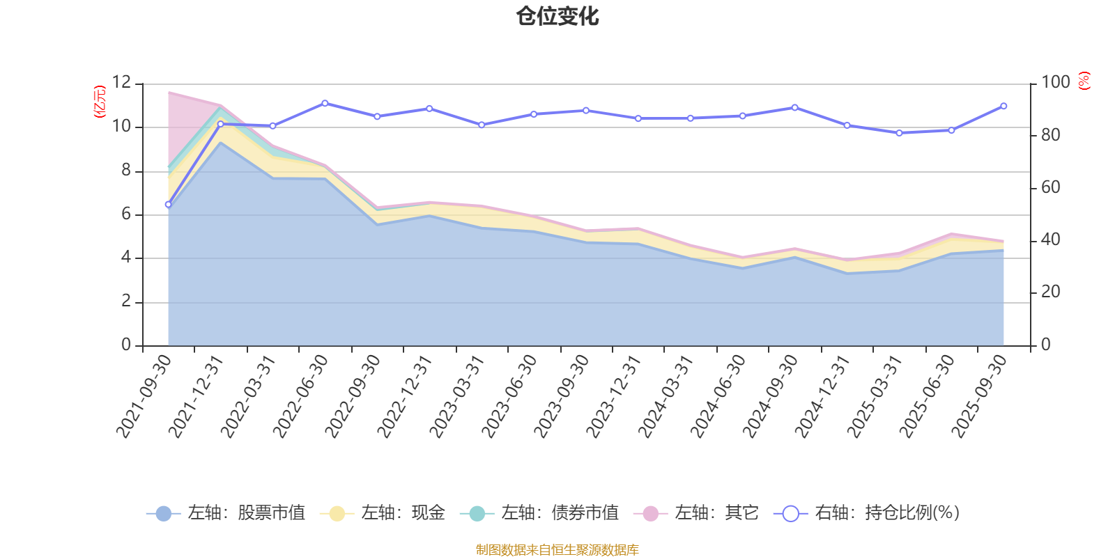 据定期报告数据统计,近三年平均股票仓位为86.96%,同类平均为86.94%。2022年上半年末基金达到92.5%的最高仓位,2021年三季度末最低,为53.9%。