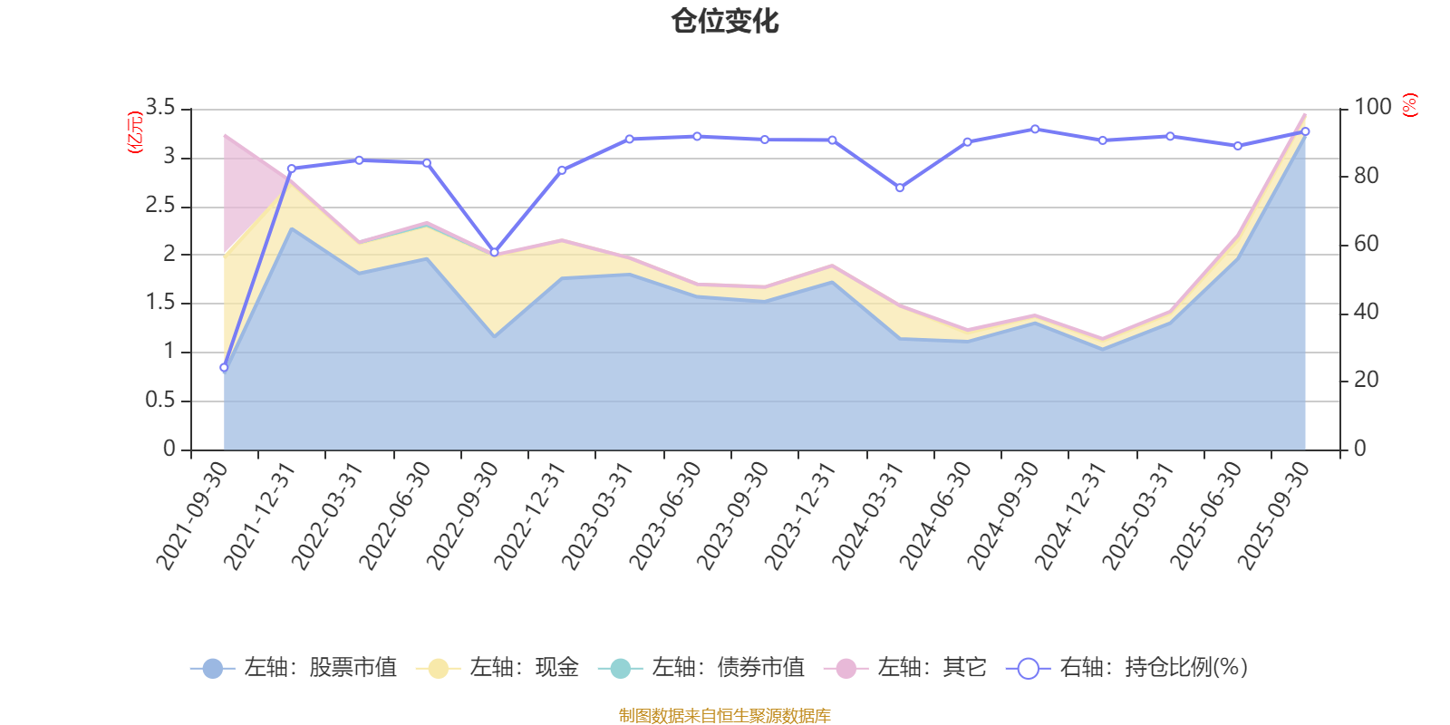 据定期报告数据统计,近三年平均股票仓位为89.42%,同类平均为86.94%。2024年三季度末基金达到94.06%的最高仓位,2021年三季度末最低,为24.18%。