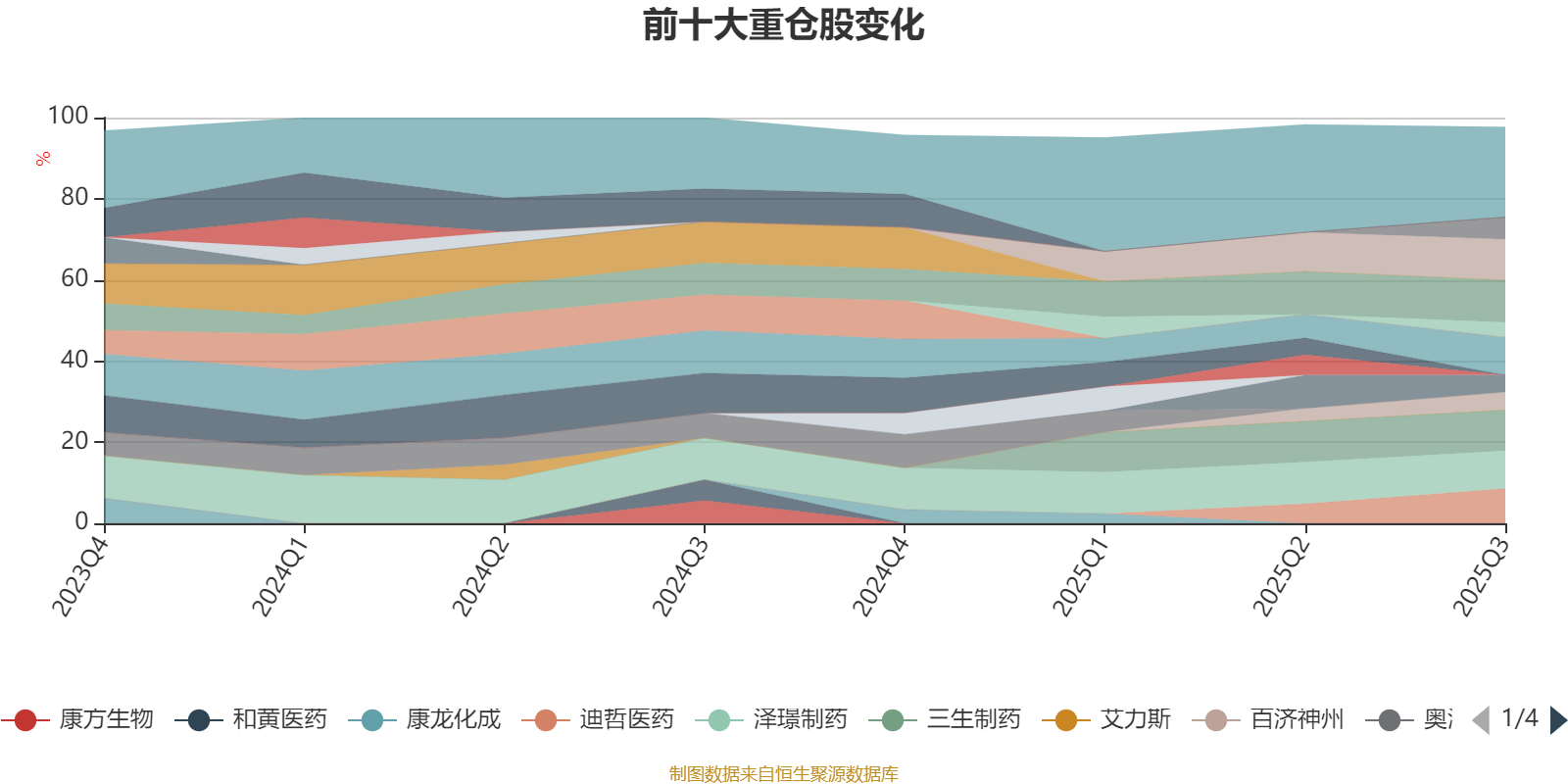 该基金持股集中度较高,近2年前十大重仓股集中度长期超过60%。截至2025年三季度末,基金十大重仓股分别是信达生物、中国生物制药、三生制药、泽璟制药、迈威生物、迪哲医药、天智航、百济神州、特宝生物、百利天恒。