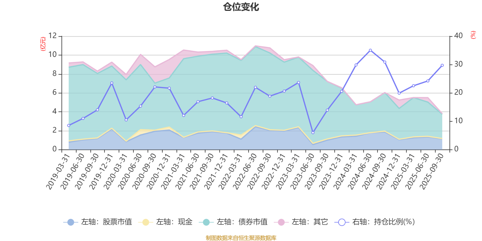 据定期报告数据统计,近三年平均股票仓位为23.07%,同类平均为72.35%。2024年上半年末基金达到35.03%的最高仓位,2023年上半年末最低,为5.97%。