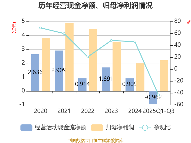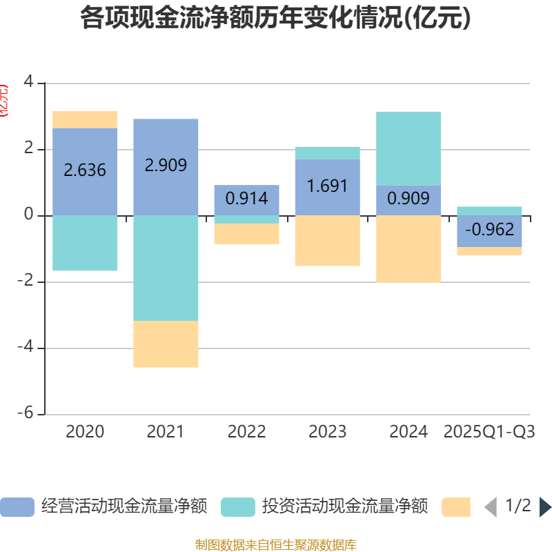 2025年前三季度,公司经营活动现金流净额为-9624.09万元,同比减少1.26亿元;筹资活动现金流净额-2475.62万元,同比增加2.37亿元;投资活动现金流净额2596.34万元,上年同期为3.5亿元。
