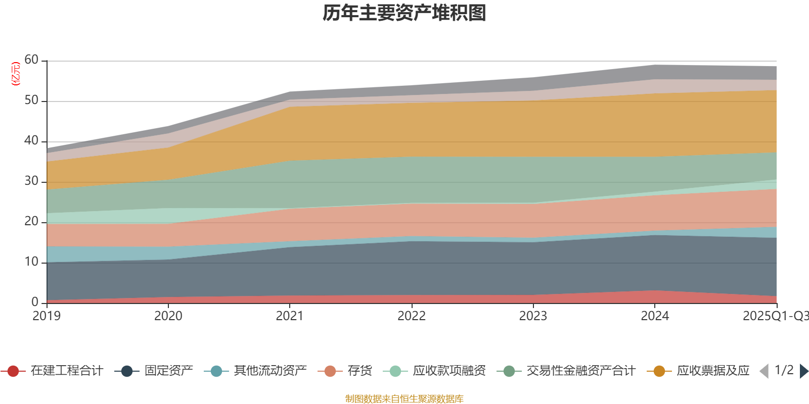 资产重大变化方面,截至2025年三季度末,公司交易性金融资产合计较上年末减少22.26%,占公司总资产比重下降3.19个百分点;其他流动资产较上年末增加141.92%,占公司总资产比重上升2.72个百分点;应收款项融资较上年末增加159.95%,占公司总资产比重上升2.46个百分点;在建工程合计较上年末减少46.55%,占公司总资产比重下降2.46个百分点。