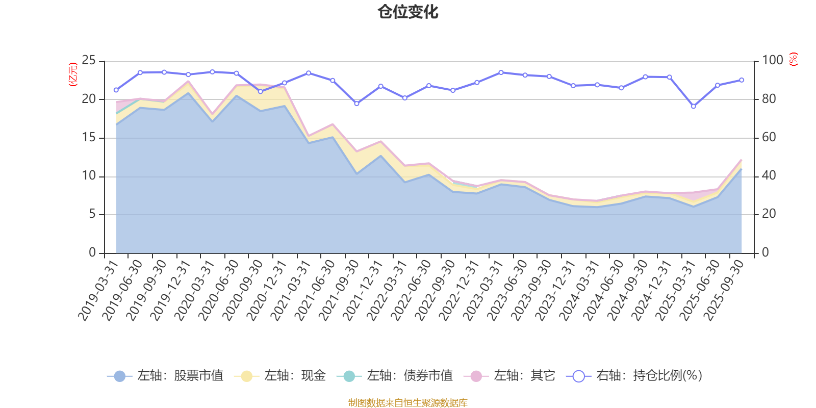 据定期报告数据统计,近三年平均股票仓位为88.89%,同类平均为85.99%。2020年一季度末基金达到94.44%的最高仓位,2025年一季度末最低,为76.51%。
