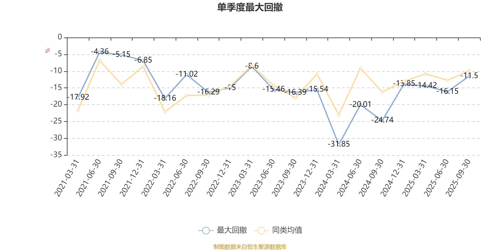 截至10月29日,基金近三年最大回撤为57.2%,同类可比基金排名149/159。单季度最大回撤出现在2024年一季度,为31.85%。