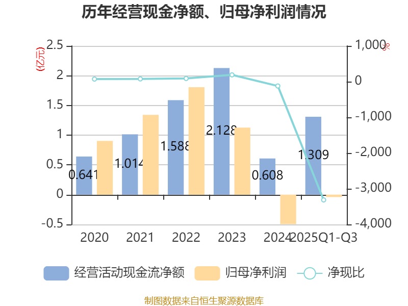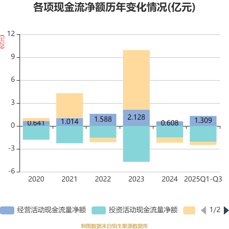 2025年前三季度,公司经营活动现金流净额为1.31亿元,同比增长951.26%;筹资活动现金流净额-4330.17万元,同比减少802.76万元;投资活动现金流净额-2.06亿元,上年同期为-5.09亿元。
