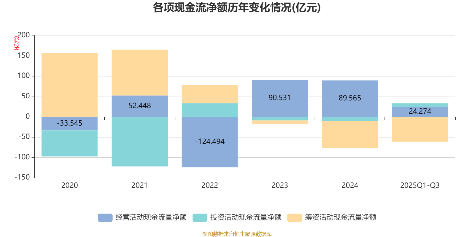 2025年前三季度,公司经营活动现金流净额为24.27亿元,同比下降52.15%;筹资活动现金流净额-61.1亿元,同比增加20.5亿元;投资活动现金流净额8.84亿元,上年同期为2.73亿元。