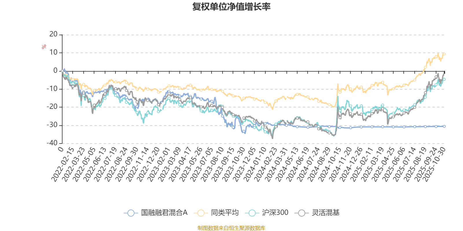 截至10月30日,国融融君混合A近三个月复权单位净值增长率为0.28%,位于同类可比基金99/113;近半年复权单位净值增长率为0.46%,位于同类可比基金105/113;近一年复权单位净值增长率为1.23%,位于同类可比基金100/113;近三年复权单位净值增长率为-15.98%,位于同类可比基金104/113。
