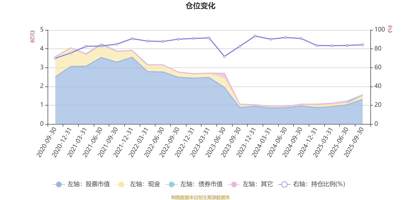据定期报告数据统计,近三年平均股票仓位为86.59%,同类平均为72.35%。2023年末基金达到93.57%的最高仓位,2020年三季度末最低,为70.02%。