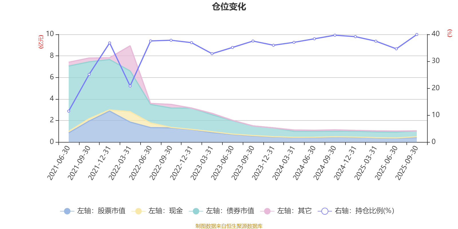 据定期报告数据统计,近三年平均股票仓位为37.05%,同类平均为19.14%。2025年三季度末基金达到39.94%的最高仓位,2021年上半年末最低,为11.5%。