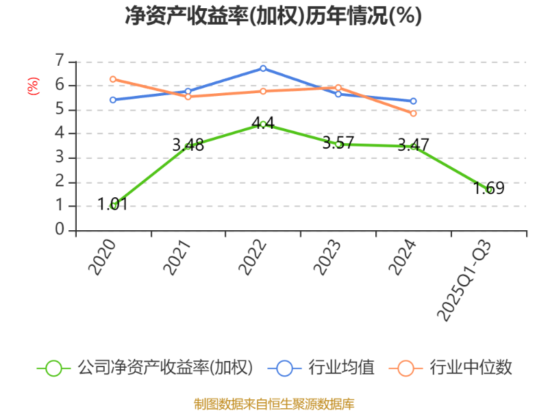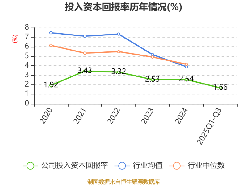 盈利能力方面, 2025年前三季度公司加权平均净资产收益率为1.69%,同比上升0.37个百分点。公司2025年前三季度投入资本回报率为1.66%,较上年同期上升0.07个百分点。