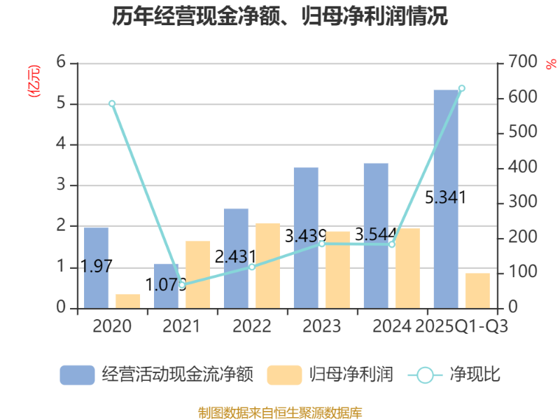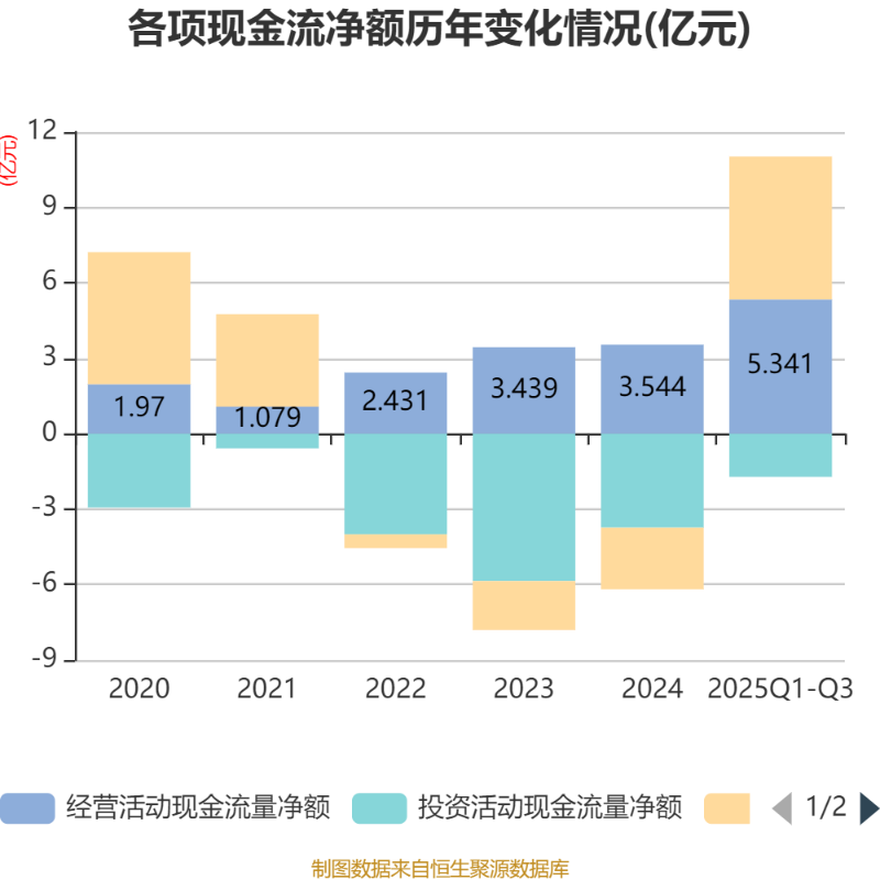 2025年前三季度,公司经营活动现金流净额为5.34亿元,同比增长34.41%;筹资活动现金流净额5.68亿元,同比增加7.4亿元;投资活动现金流净额-1.71亿元,上年同期为-2.55亿元。