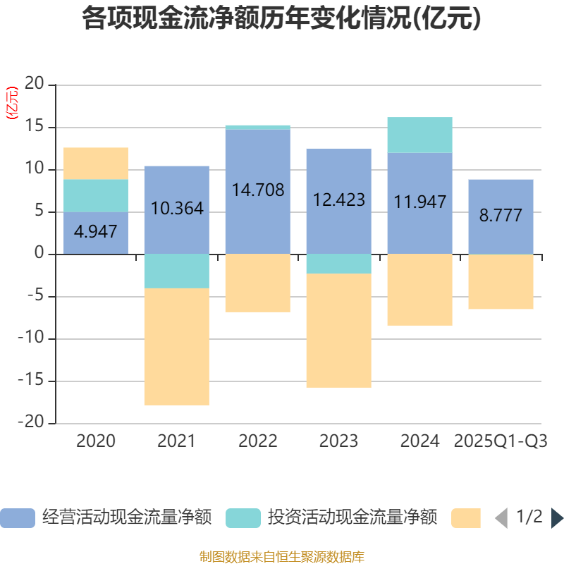 2025年前三季度,公司经营活动现金流净额为8.78亿元,同比增长9.99%;筹资活动现金流净额-6.45亿元,同比增加2504.22万元;投资活动现金流净额-778.68万元,上年同期为-3572.17万元。