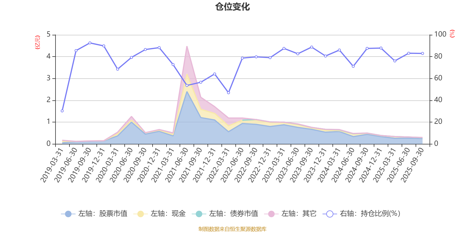 据定期报告数据统计,近三年平均股票仓位为82.77%,同类平均为72.35%。2019年三季度末基金达到92.56%的最高仓位,2019年一季度末最低,为30.3%。