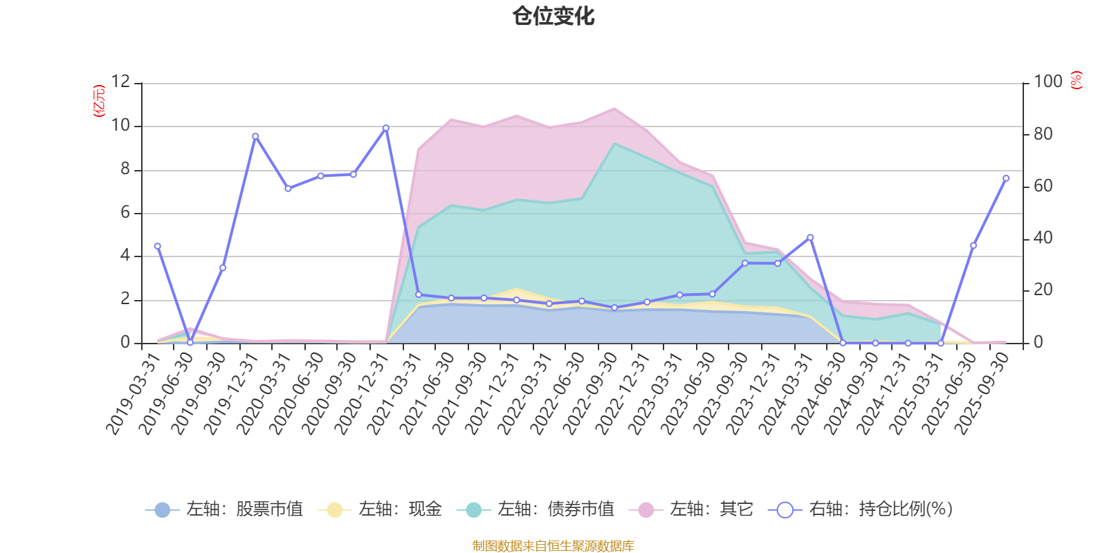 据定期报告数据统计,近三年平均股票仓位为21.37%,同类平均为72.35%。2020年末基金达到82.7%的最高仓位,2024年末最低,为0.01%。