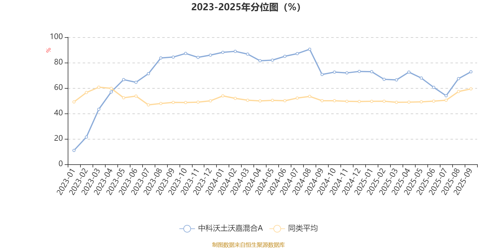 通过所选区间该基金净值增长率分位图,可以观察该基金与同类基金业绩比较情况。图为坐标原点到区间内某时点的净值增长率在同类基金中的分位数。