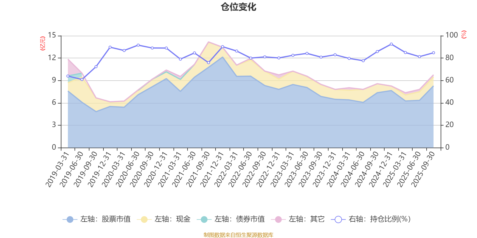 据定期报告数据统计,近三年平均股票仓位为83.13%,同类平均为72.35%。2024年末基金达到92.51%的最高仓位,2019年上半年末最低,为60.9%。