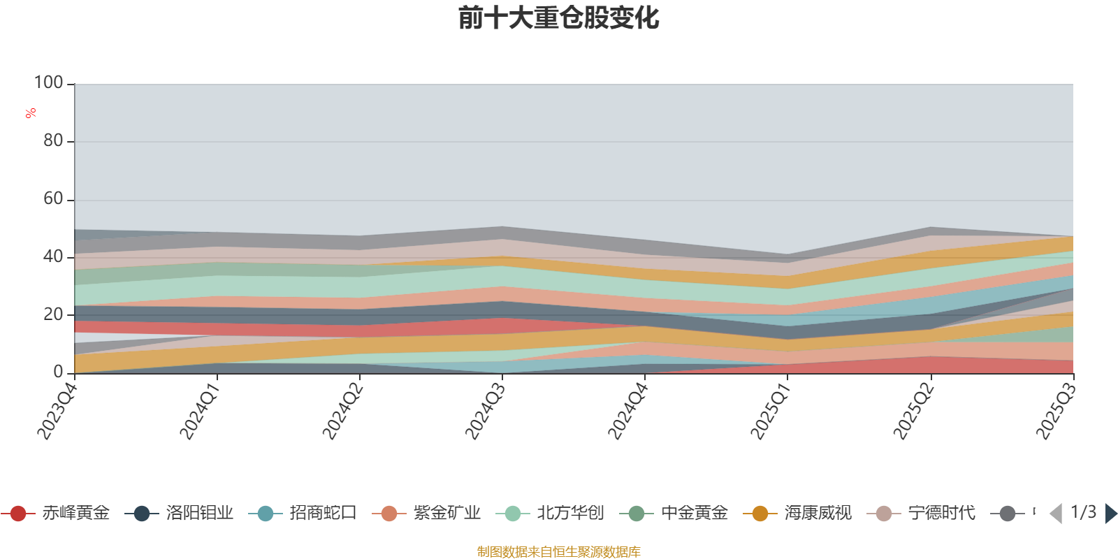 截至2025年三季度末,基金十大重仓股分别是紫金矿业、中金黄金、海康威视、山东黄金、山金国际、中芯国际、赤峰黄金、神火股份、中国平安、宁德时代。
