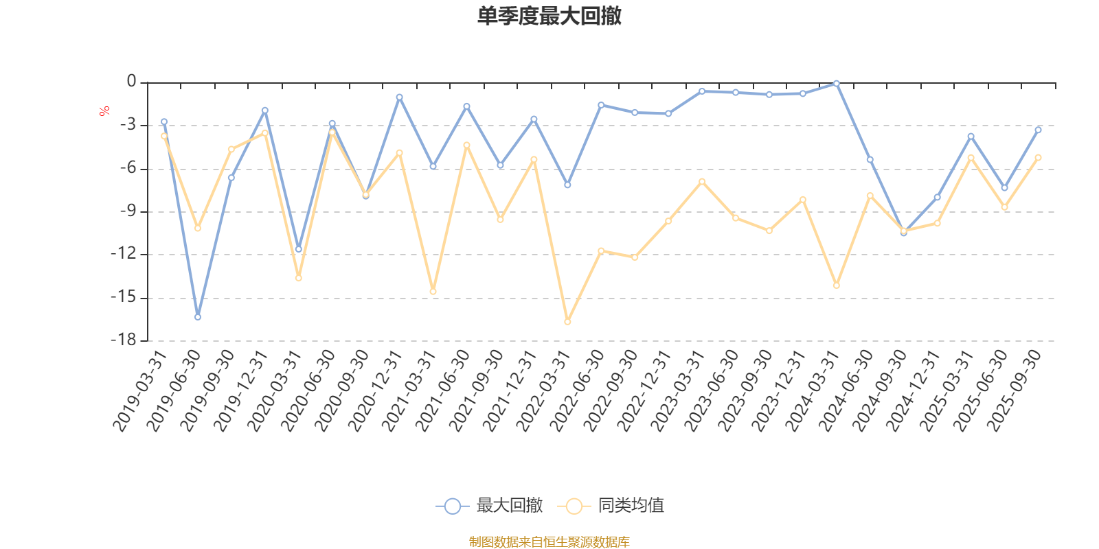 截至10月27日,基金近三年最大回撤为14.75%,同类可比基金排名192/1274。单季度最大回撤出现在2019年二季度,为16.35%。