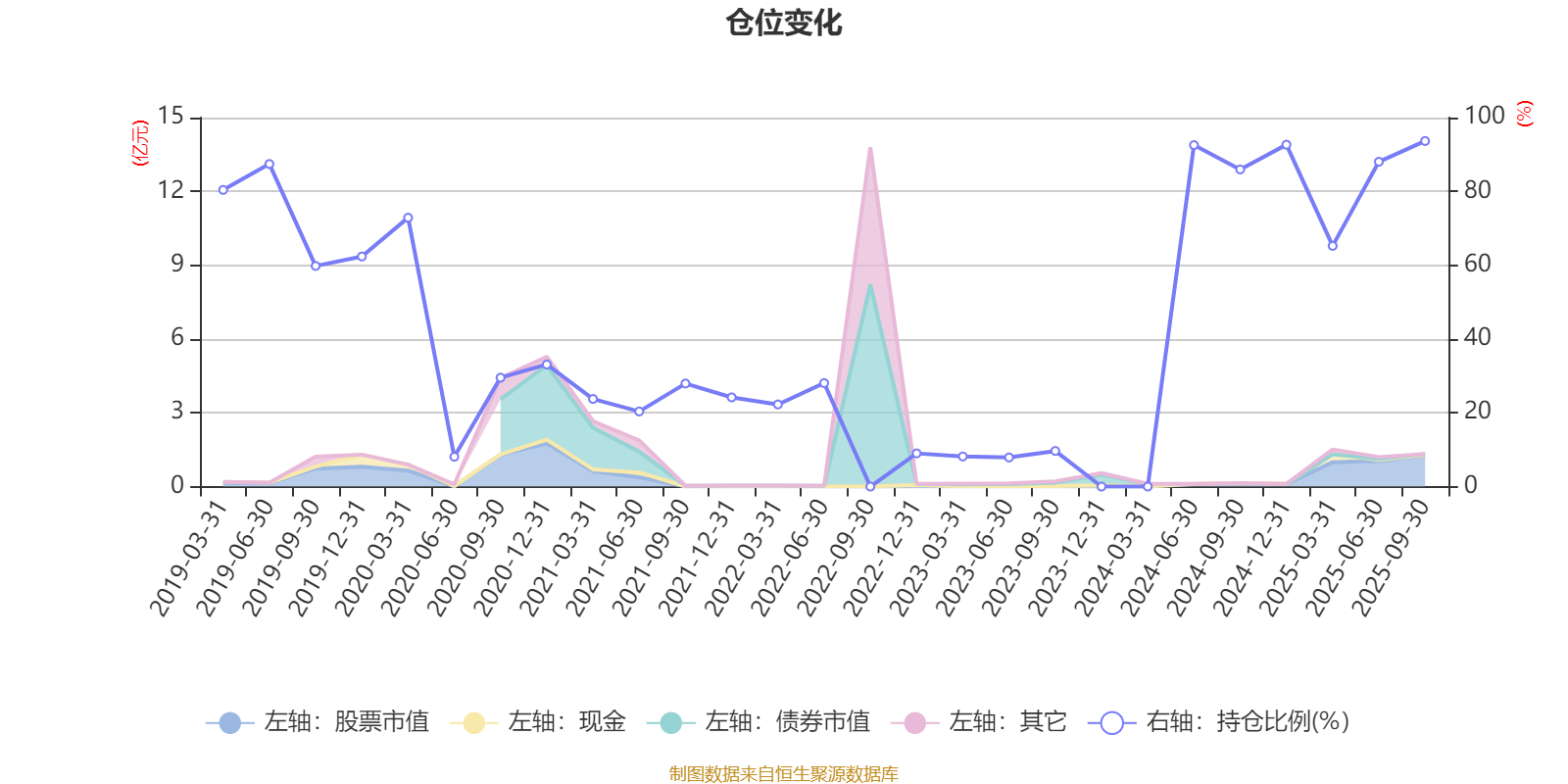 据定期报告数据统计,近三年平均股票仓位为46.06%,同类平均为72.35%。2025年三季度末基金达到93.66%的最高仓位,2023年上半年末最低,为7.88%。