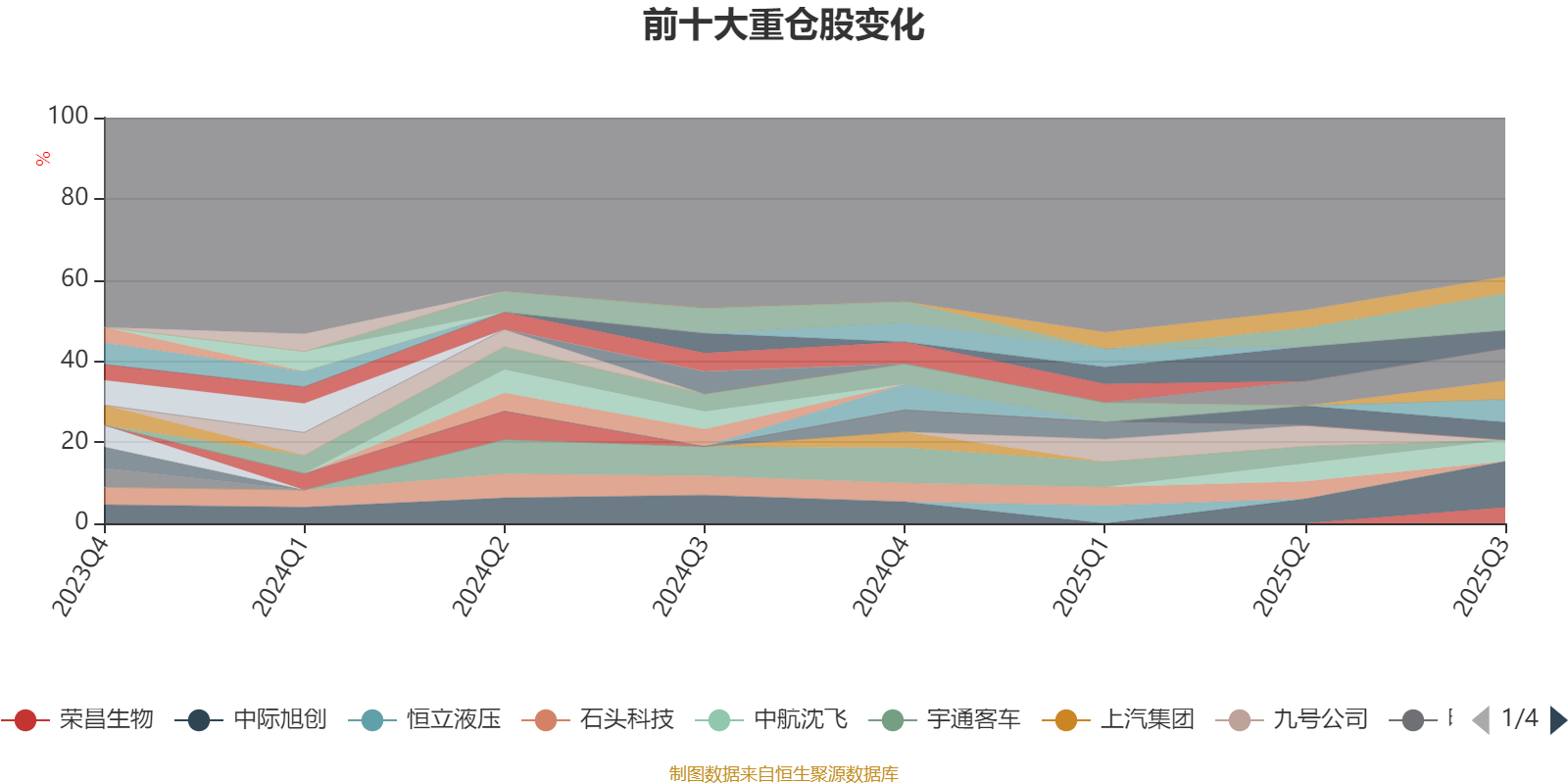 截至2025年三季度末,基金十大重仓股分别是中际旭创、新易盛、浙江荣泰、寒武纪、中航沈飞、恺英网络、胜宏科技、苑东生物、蓝思科技、荣昌生物。