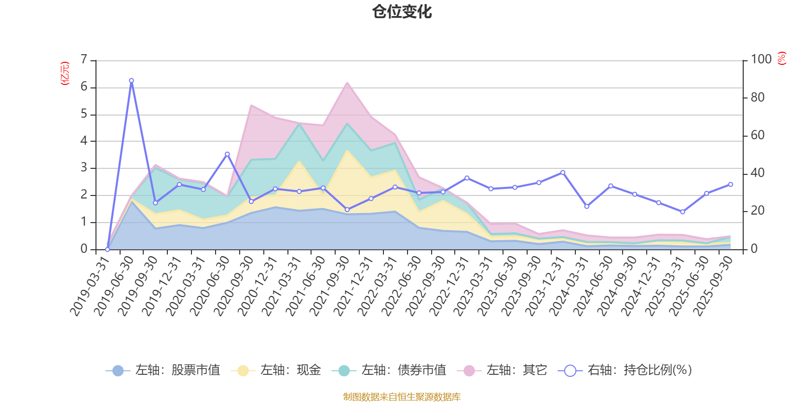 据定期报告数据统计,近三年平均股票仓位为31.09%,同类平均为72.35%。2019年上半年末基金达到89.32%的最高仓位,2025年一季度末最低,为19.93%。
