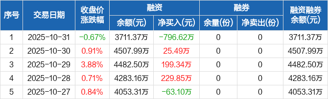 融资方面,当日融资买入966.77万元,融资偿还1763.39万元,融资净偿还796.62万元。融券方面,融券卖出0份,融券偿还0份,融券余量0份,融券余额0元。融资融券余额合计3711.37万元。
