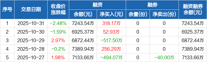 融资方面,当日融资买入1590.29万元,融资偿还1272.12万元,融资净买入318.17万元。融券方面,融券卖出0份,融券偿还0份,融券余量0份,融券余额0元。融资融券余额合计7243.54万元。