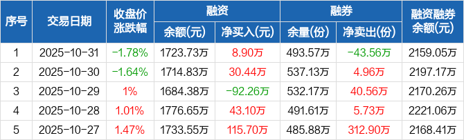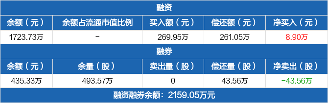 融资方面,当日融资买入269.95万元,融资偿还261.05万元,融资净买入8.9万元。融券方面,融券卖出0份,融券偿还43.56万份,融券余量493.57万份,融券余额435.33万元。融资融券余额合计2159.05万元。