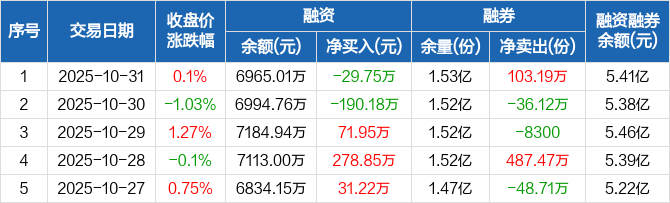 融资方面,当日融资买入1152.71万元,融资偿还1182.47万元,融资净偿还29.75万元。融券方面,融券卖出103.19万份,融券偿还0份,融券余量1.53亿份,融券余额4.72亿元。融资融券余额合计5.41亿元。
