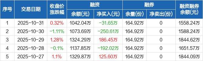 融资方面,当日融资买入174.7万元,融资偿还206.35万元,融资净偿还31.65万元。融券方面,融券卖出0份,融券偿还0份,融券余量164.92万份,融券余额516.2万元。融资融券余额合计1558.24万元。