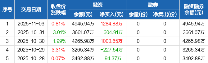 融资方面,当日融资买入2123.7万元,融资偿还838.82万元,融资净买入1284.88万元。融券方面,融券卖出0份,融券偿还0份,融券余量0份,融券余额0元。融资融券余额合计4945.94万元。