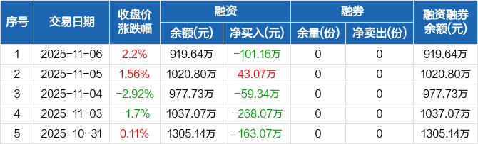 融资方面,当日融资买入170.17万元,融资偿还271.34万元,融资净偿还101.16万元。融券方面,融券卖出0份,融券偿还0份,融券余量0份,融券余额0元。融资融券余额合计919.64万元。