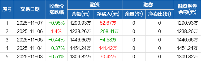 融资方面,当日融资买入309.27万元,融资偿还256.6万元,融资净买入52.67万元。融券方面,融券卖出0份,融券偿还0份,融券余量0份,融券余额0元。融资融券余额合计1290.93万元。