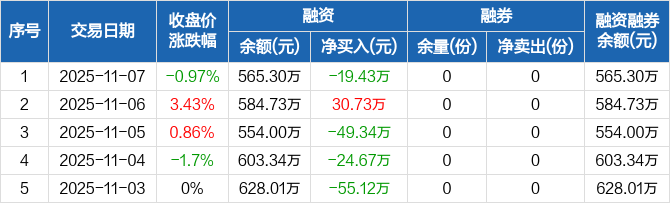 融资方面,当日融资买入64.42万元,融资偿还83.85万元,融资净偿还19.43万元。融券方面,融券卖出0份,融券偿还0份,融券余量0份,融券余额0元。融资融券余额合计565.3万元。