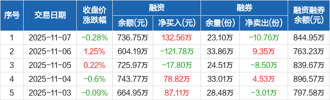 沪深300ETF南方融资融券信息显示,2025年11月7日融资净买入132.56万元;融资余额736.75万元,较前一日增加21.94%。