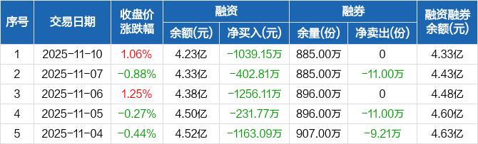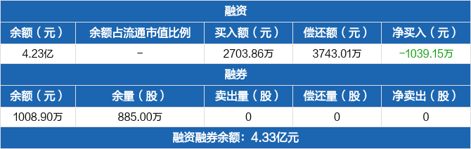 融资方面,当日融资买入2703.86万元,融资偿还3743.01万元,融资净偿还1039.15万元,连续5日净偿还累计4092.94万元。融券方面,融券卖出0份,融券偿还0份,融券余量885万份,融券余额1008.9万元。融资融券余额合计4.33亿元。