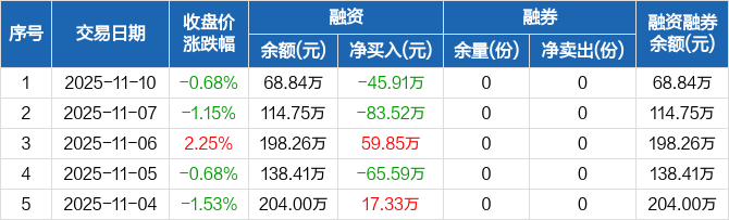 融资方面,当日融资买入45.8万元,融资偿还91.72万元,融资净偿还45.91万元。融券方面,融券卖出0份,融券偿还0份,融券余量0份,融券余额0元。融资融券余额合计68.84万元。