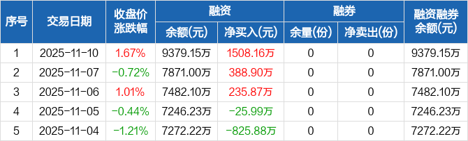 融资方面,当日融资买入2893.27万元,融资偿还1385.11万元,融资净买入1508.16万元,连续3日净买入累计2132.92万元。融券方面,融券卖出0份,融券偿还0份,融券余量0份,融券余额0元。融资融券余额合计9379.15万元。