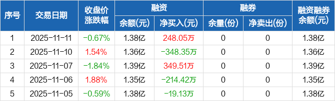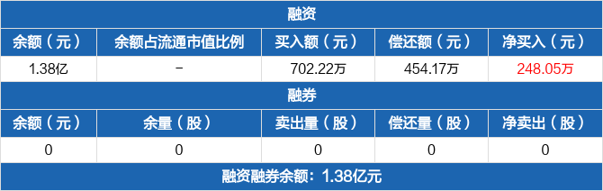 融资方面,当日融资买入702.22万元,融资偿还454.17万元,融资净买入248.05万元。融券方面,融券卖出0份,融券偿还0份,融券余量0份,融券余额0元。融资融券余额合计1.38亿元。