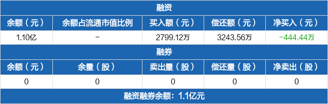融资方面,当日融资买入2799.12万元,融资偿还3243.56万元,融资净偿还444.44万元。融券方面,融券卖出0份,融券偿还0份,融券余量0份,融券余额0元。融资融券余额合计1.1亿元。