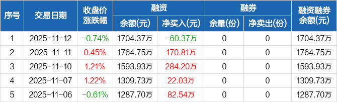 融资方面,当日融资买入306.39万元,融资偿还366.76万元,融资净偿还60.37万元。融券方面,融券卖出0份,融券偿还0份,融券余量0份,融券余额0元。融资融券余额合计1704.37万元。