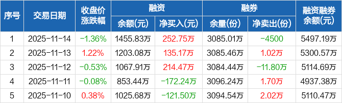 融资方面,当日融资买入665.55万元,融资偿还412.8万元,融资净买入252.75万元,连续3日净买入累计602.39万元。融券方面,融券卖出0份,融券偿还4500份,融券余量3085.01万份,融券余额4041.36万元。融资融券余额合计5497.19万元。