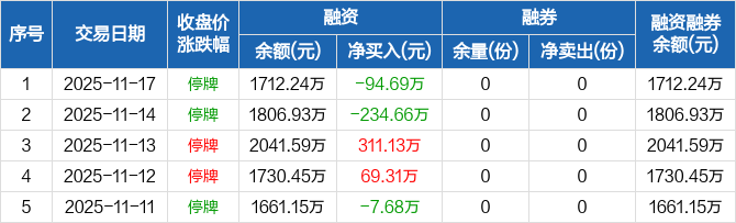 融资方面,当日融资买入330.29万元,融资偿还424.97万元,融资净偿还94.69万元。融券方面,融券卖出0份,融券偿还0份,融券余量0份,融券余额0元。融资融券余额合计1712.24万元。