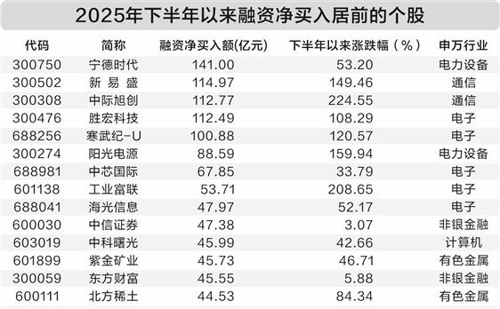其中宁德时代、新易盛、中际旭创、胜宏科技、寒武纪-U排在前五名,融资净买入额均超100亿元,阳光电源、中芯国际、工业富联紧随其后,融资净买入额均在50亿元以上。