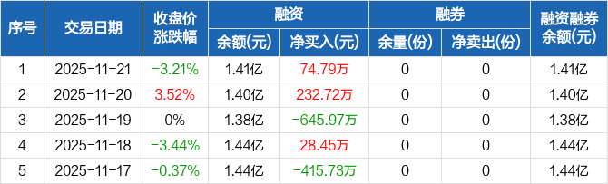 融资方面,当日融资买入1672.78万元,融资偿还1597.99万元,融资净买入74.79万元。融券方面,融券卖出0份,融券偿还0份,融券余量0份,融券余额0元。融资融券余额合计1.41亿元。