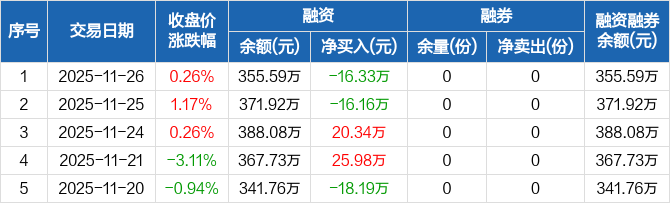 融资方面,当日融资买入71.78万元,融资偿还88.11万元,融资净偿还16.33万元。融券方面,融券卖出0份,融券偿还0份,融券余量0份,融券余额0元。融资融券余额合计355.59万元。